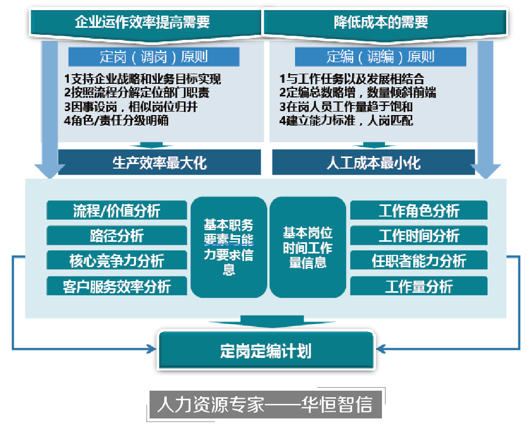 华恒智信认为定岗设计的目标就是实现企业运作效率最大化,定编设计的目标是实现人工成本最低化。为了实现这这个目标,企业分别要做两个系列的量化分析工作。在岗位设计方面需要进行工作流程/价值链的分析、工作路径的分析、核心竞争力的分析以及服务效率的分析。在编制设计方面进行工作角色的分析,实际工作时间的分析(例如实际完成任务时间和准备时间)、任职者能力分析、工作量等分析工作。这些工作顺利完成之后,可以提出一个对现阶段工作有指导意义的定岗定编计划,其中包含一系列测算公式,以利于企业随着任务的变化而及时调整人数和岗位。