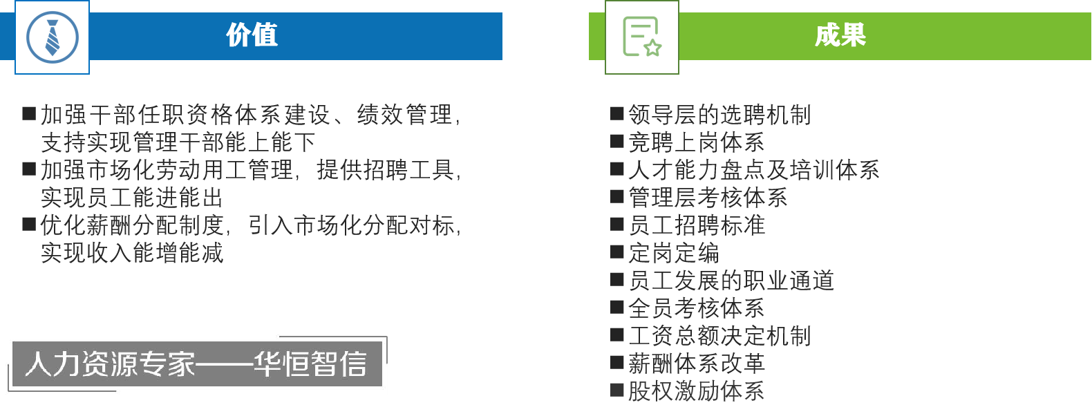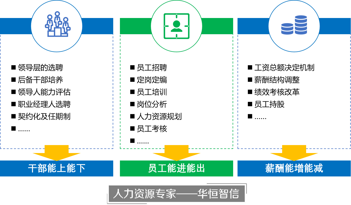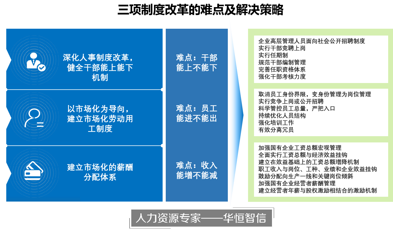 华恒智信提出,在“人事改革、劳动改革、分配改革”中,最核心的难点在于“干部怎么下、员工怎么出、薪酬怎么减”,针对这些改革难点痛点,华恒智信专家组提出了配套的管理基础,来支持整体改革深化。