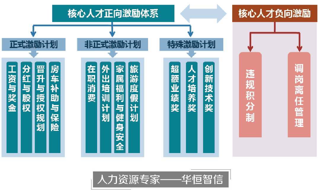 企业的激励可以从多个纬度分解,可以从物质层面分成核心人才的物质激励与精神激励;也可以从方法分成正向激励与负向激励;还可以从激励的频度与感受分成正式激励与非正式激励。华恒智信综合以上思路,形成独特的正负结合的激励体系,该体系包括一系列正式激励计划,非正式激励标准,特殊情况奖励,违规的处罚标准,调职离任的管理等几部分。