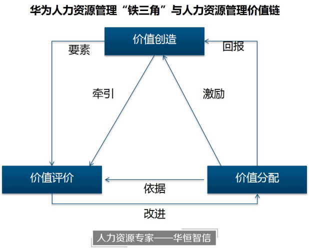华为人力资源管理体系的搭建应该始于《华为基本法》,在基本法里华为确立了人力资源管理的铁三角,那就是价值创造体系、价值评价体系和价值分配体系,由这三个体系构成了华为人力资源管理价值链,成为华为人力资源管理的核心,如下图所示。