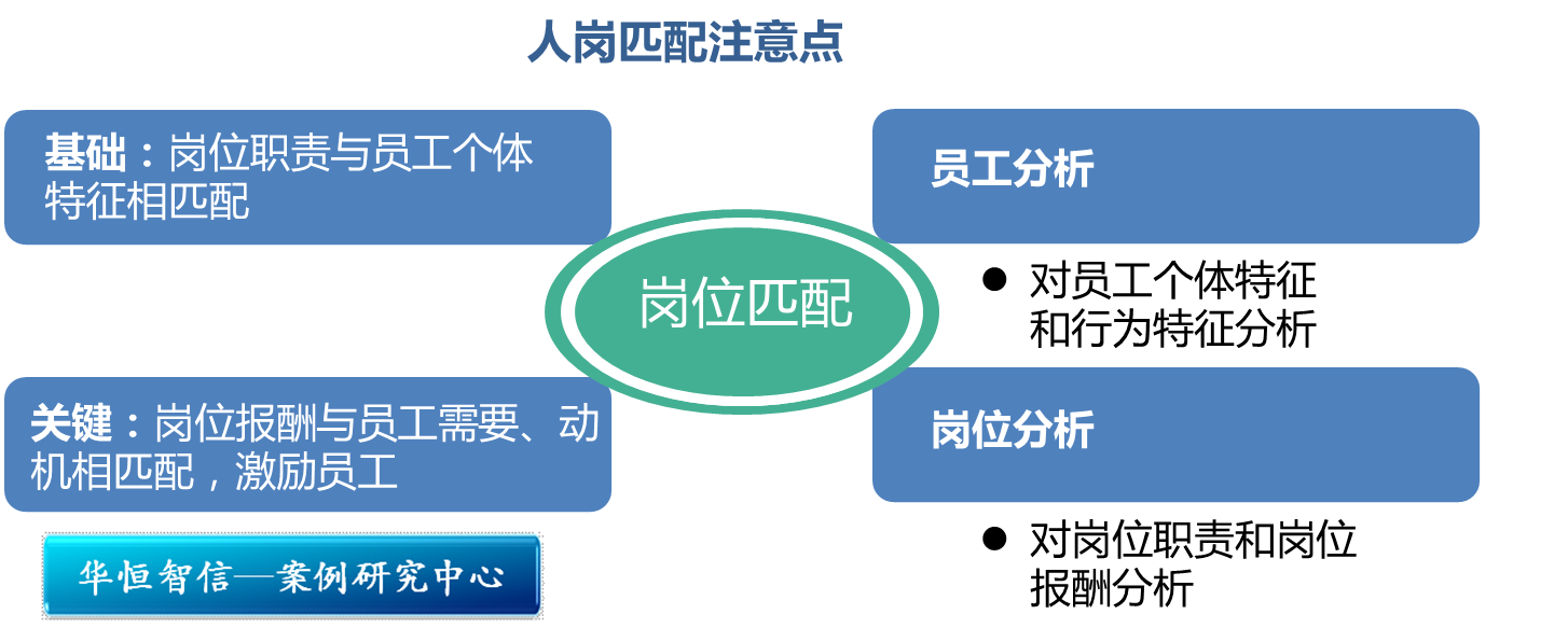 对人力资源进行有效配置和合理使用的基础是人岗匹配。要做到人岗匹配需进行员工分析和岗位分析。员工分析主要是对员工个体特征和行为特征分析,岗位分析是对岗位职责和岗位报酬分析。要做到人岗匹配须把握两点:一方面岗位职责与员工个体特征相匹配是基础,另一方面岗位报酬与员工需要、动机相匹配,激励员工行为是关键。
