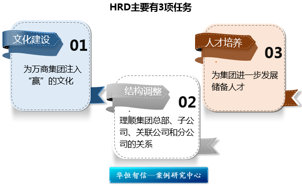 吴军上任之前,赵刚说明HRD主要有3项任务,一是文化建设,为万商集团注入“赢”的文化;二是结构调整,理顺集团总部、子公司、关联公司和分公司的关系;三是人才培养,为集团进一步发展储备人才。