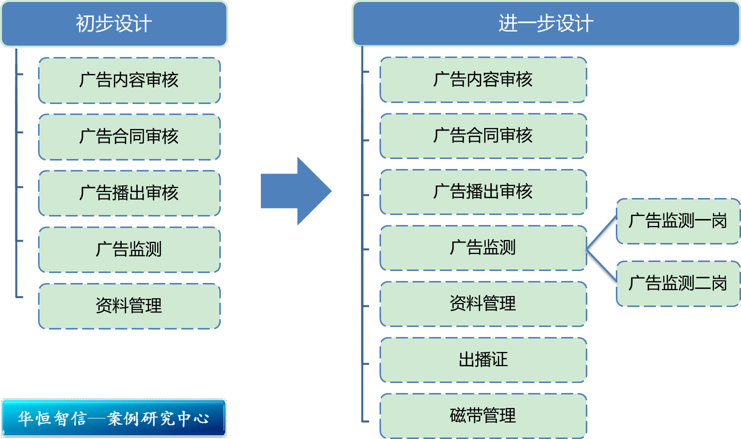 面对上述问题,该部门的主管与员工认为,有必要对工作岗位进行科学设计,于是,将部门工作分解到5个岗位:1、广告内容审核;2、广告合同审核;3、广告播出审核;4、广告监测;5、资料管理。这一方案经过一段时间的运作后,员工发现岗位间难易程度、责任大小、工作量差异较大。该部门又根据员工的提议,对上述岗位重新设计:将广告播出审核岗位分为监测一岗、监测二岗;增设出播证岗位,专职出具广告播出证明并负责广告播出情况核实;增设了磁带管理岗位,负责录制节目磁带的归类、摆放、查询及办理供阅手续。 在岗位设计好以后,该部门用文字的形式对“岗位职责”进行了规范和明确。