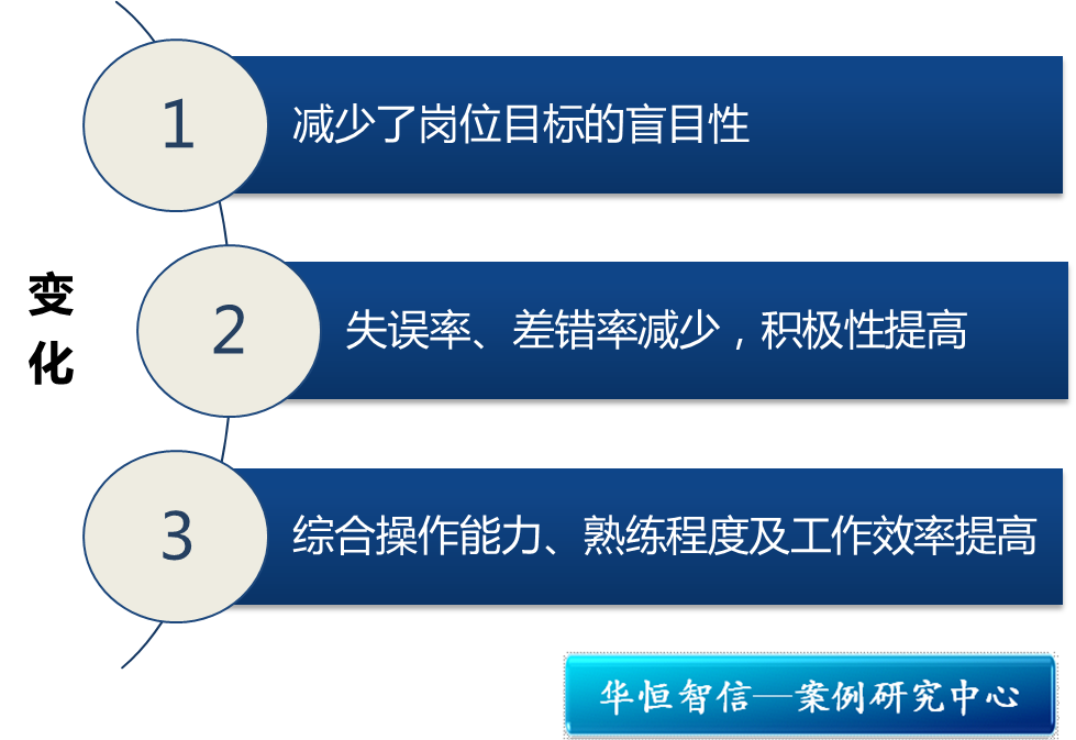 一年后,该部门发生了如下变化:1、员工对岗位责任、难易程度、工作量和工作的风险性心中有数从而减少了岗位目标的盲目性。2、由于职责明确,员工失误率、差错率明显减少,员工的积极性得到了较大提高。3、轮岗之后,员工的综合操作能力、熟练程度及工作效率均有不同程度的提高。大家对全局工作有了更强的适应力,能将各岗位间的技能灵活应用。
