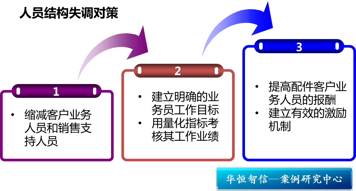 首先,缩减配套客户业务人员和销售支持人员,选择优秀的、有市场开拓精神的员工充实到配件客户业务员和配件市场服务工程师等岗位上,增强零配件市场的销售力量,夺回失去的市场份额,确保企业的利润收益稳步增长。