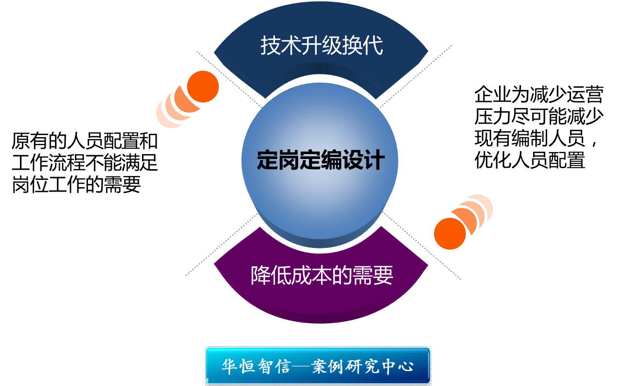 企业的定岗定编设计主要出于两方面的考虑:一是由于技术升级换代导致工作或管理流程等发生变化,原有的人员配置和工作流程不能满足岗位工作的需要;二是出于降低成本的需要,企业的人力成本是企业经营成本中的比重较大的一项,在原材料价格上涨,员工薪酬增加的基础上,为了维持企业的运营,减轻经营压力,企业往往选择重新定岗定编,尽可能减少现有编制人员,优化人员配置。