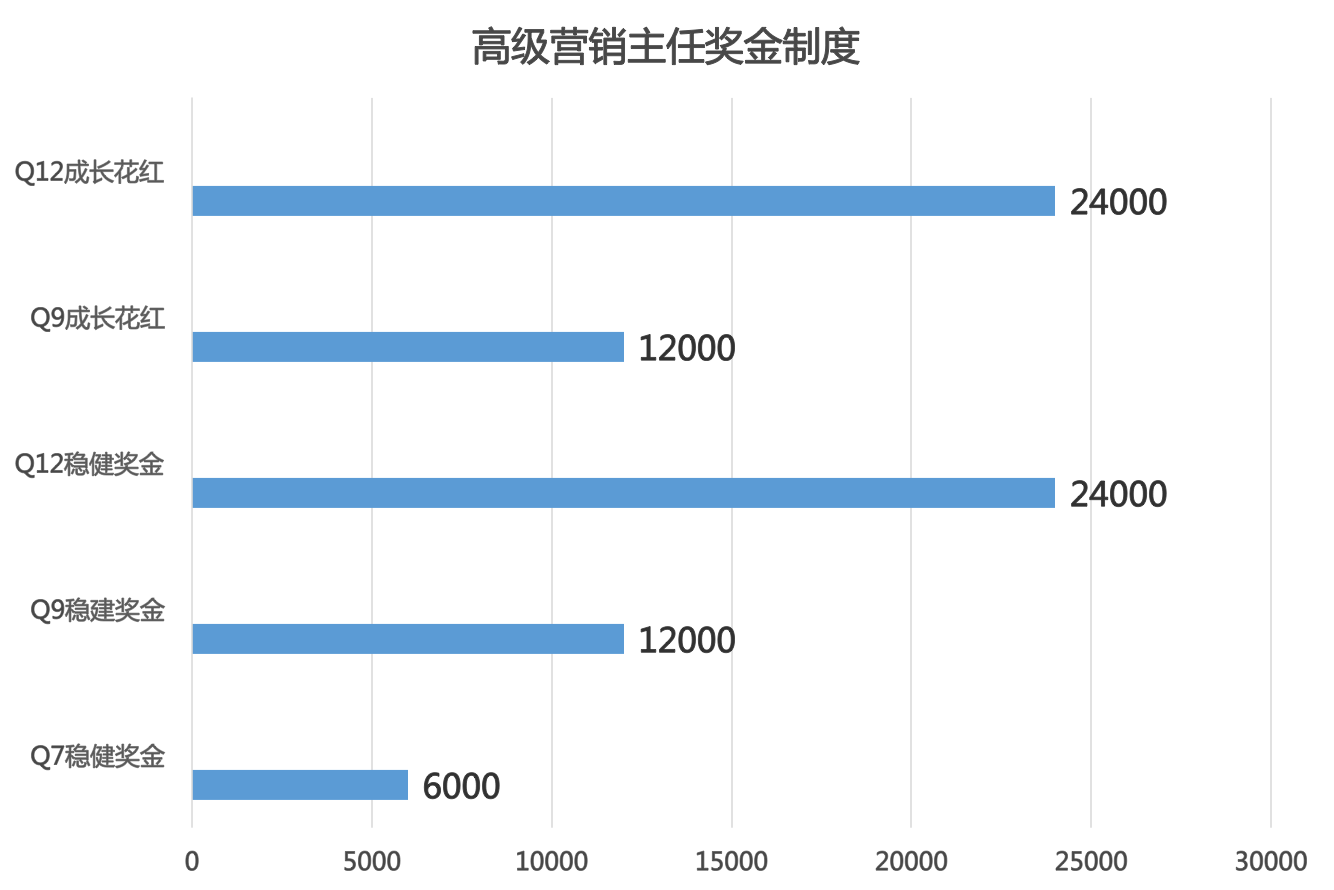 对于业绩好的高级营销主任给予:Q7稳健奖金,奖人民币6,000元。Q9稳建奖金,奖人民币12,000元。Q12稳健奖金,奖金24,000元。Q9成长花红,奖人民币12,000元。Q12成长花红,奖24,000元。
