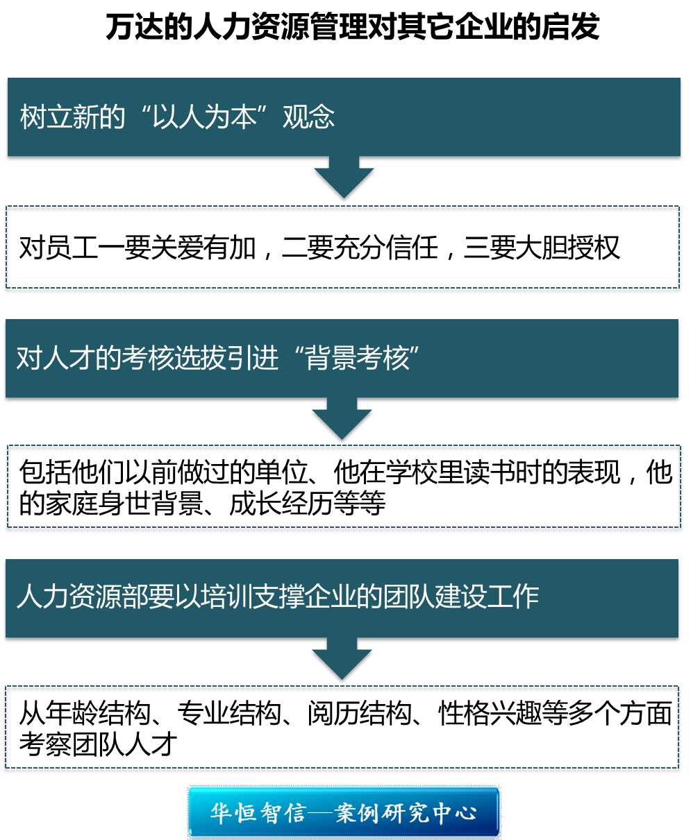 万达认为:合适的人是企业发展的首要资本。多年来,万达也一直致力于人力资源管理的不断完善,希望通过人力资源管理为企业发展提供更坚实的支撑。华恒智信人力资源管理专家认为,万达的人力资源管理有着许多新颖之处,这对于其它企业的人力资源管理也是一种启发: