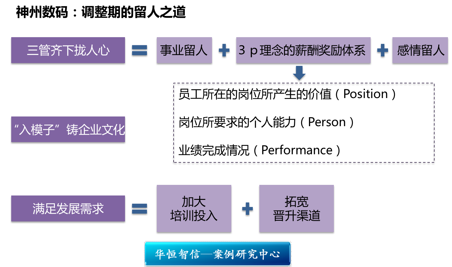 其次,待遇问题虽然非常敏感,但解决起来也相对简单,公司主要通过3p理念的薪酬奖励体系保证其薪资的吸引力,主要包括三方面:员工所在的岗位所产生的价值(position);岗位所要求的个人能力(person);业绩完成情况(performance)。神州数码的全员持股计划,也将员工发展与企业的发展牢牢捆在一起。