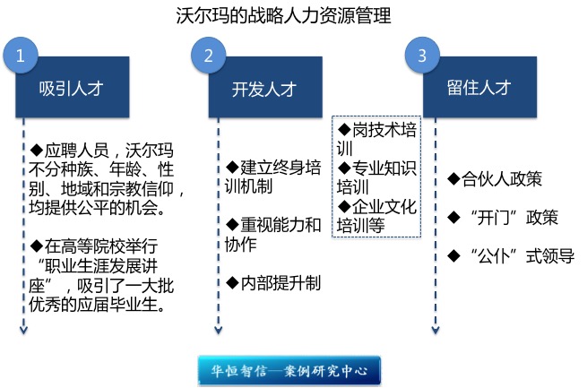 1、在吸引人才上,沃尔玛能够“不拘一格降人才”。沃尔玛虽然重视内部培养,但也注意从外部引进高级人才。对于应聘人员,沃尔玛不分种族、年龄、性别、地域和宗教信仰,均提供公平的机会,开放的平台和包容的态度,成功地帮助吸引了大量人才。这不仅丰富了公司的人才储备,而且也为沃尔玛注入了新的血液和新的活力。