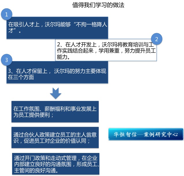3、在人才保留上, 沃尔玛的努力主要体现在三个方面:第一,在工作氛围、薪酬福利和事业发展上为员工提供便利;第二,通过合伙人政策建立员工的主人翁意识,促进员工对企业的价值认同;第三,通过开门政策和走动式管理,在企业内部建立良好的沟通氛围,形成员工、主管间的良好沟通。