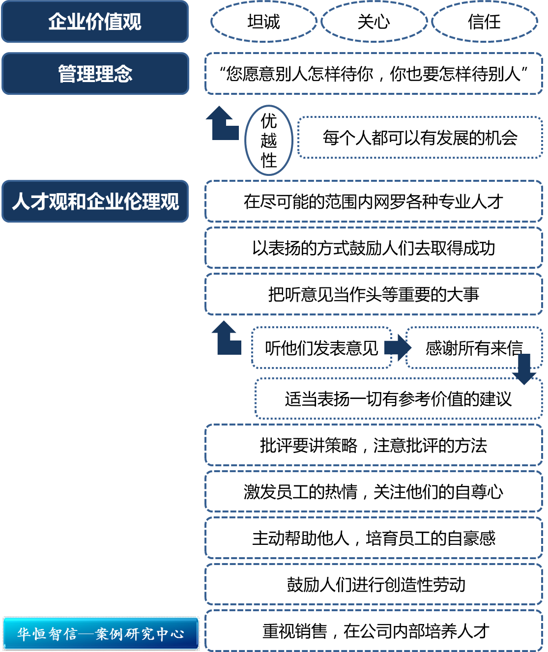 玫琳凯.阿什坚信,一家公司的好坏只取决于该公司的人。首屈一指的公司必有首屈一指的人才。人才是一家公司最重要的资产。因此,买进一家公司,现今的买方常常“坚持要求卖方公司的经理留一段时间,并常常用条件优厚的协议鼓励这些经验丰富的经理人员继续增加营业额和利润”;创办一个公司,首先是要招聘人才,要不惜重金聘请高级人才。“只要有人加入我们公司,我们就会千方百计挽留。如果他们似乎不能在某一部门发挥出自己的才干,我们尽量为他们调换工作”。她相信,每个人都有自己的专长,无论经理们如何忙,也必须花时间使别人感到他们是重要的,一个经理怎样才能使人们感到自己重要?这从根本上说是个企业伦理问题,首先是要倾听他们的意见,让他们知道你尊重他们的想法,让他们发表自己的见解。其次是既要人们承担责任,又要向他们授权,不授权会毁掉人们的自尊性,最后,应该用语言和行动明确地告诉他们,他们是受到领导的赞赏和器重的。
