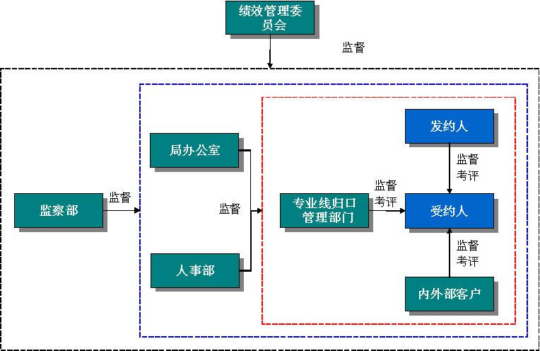 从上图我们可以看出,受到监督最多的是受约人;同时,红线以内的主体受到局办公室(相当于企管部的职能)和人事部的监督;蓝线以内的主体受到监察部的监督;黑线以内的主体受到绩效管理委员会的监督。只有这样的层层监督,才能保证执行到位。