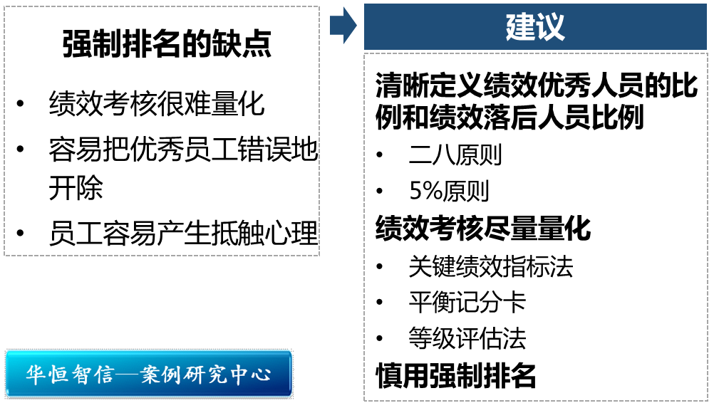 强制排名在很多企业来说,都是难以真正深入执行的一种绩效考核方法。一是有时候绩效考核很难量化,二是容易把优秀员工错误地开除,三是员工容易产生抵触心理。关于如何开展以强制排名为主要形式的绩效考核,华恒智信提醒企业注意一下三点。