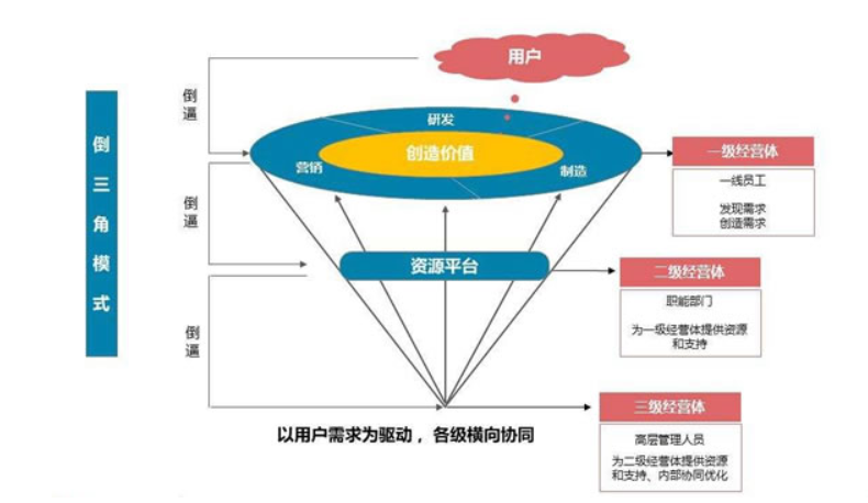自主经营体是海尔在不断发展扩张时,张瑞敏所设计的一种管理模式。这种自主经营体类似于日本京瓷的阿米巴经营模式,把员工的目标都集中到为用户创造价值上来,形成一种“倒三角”式的组织结构,客户在最上面,然后是一线经理、员工,最高领导在最下端负责为经理们提供资源。每个部门都要面对自己的客户,海尔就把它们称为“自主经营体"。