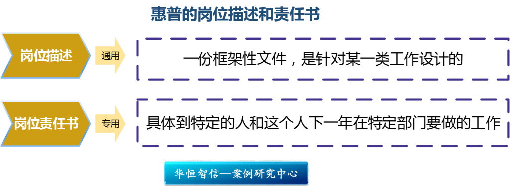在惠普,岗位描述是一份框架性文件,是针对某一类工作设计的,而岗位责任书的内容则要具体到特定的人和这个人下一年在特定部门要做的工作。
