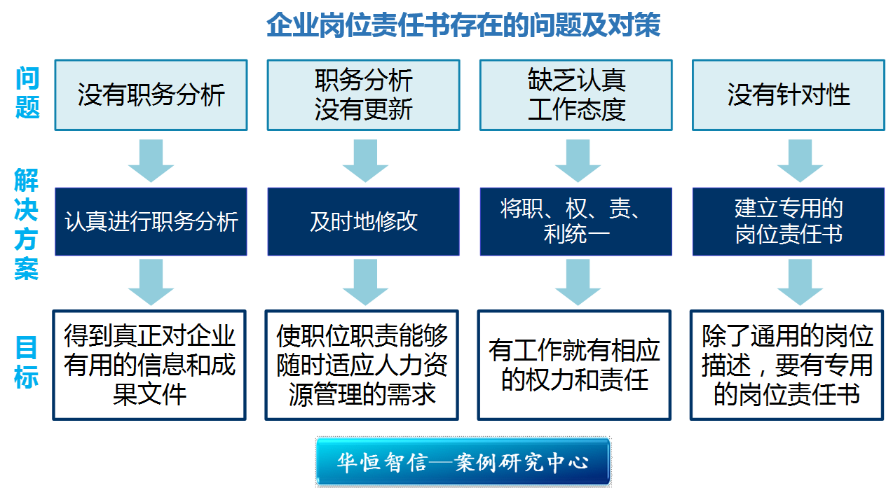 在许多企业中,你都可以查阅到厚厚的一本岗位责任手册。而实际情况是,在大多数企业里,岗位责任手册只是一套形式上的文件,只是流于形式而已。事实上,许多优秀企业,管理比较精细化的公司,大都使用岗位责任书,来代替笼统抽象的岗位职责。很多企业存在没有职务分析、职务分析没有及时更新、职务分析缺乏一定技术和经验等问题。针对这些问题,建议企业采取以下措施: