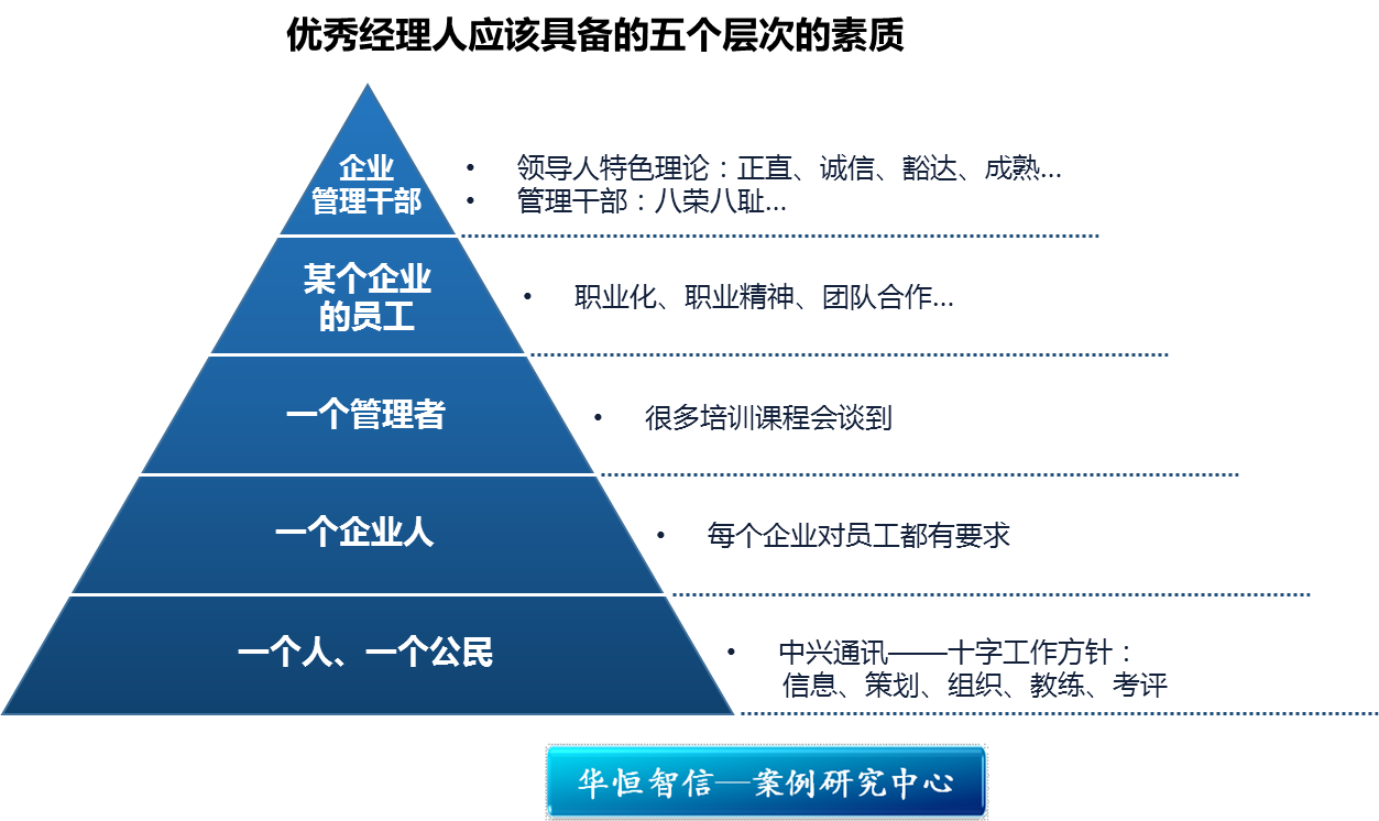 第五个层面才是某个企业管理干部应该具备的素质和能力,比如中兴通讯曾提出了“十字工作方针”:信息、策划、组织、教练、考评。
