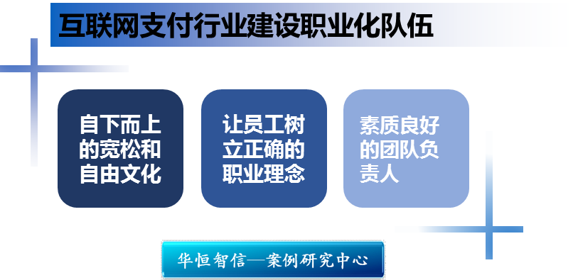 不过,要在互联网支付行业里建立一支训练有素的职业化队伍,除了自下而上的宽松和自由文化,更重要的是让员工树立正确的职业理念,告诉员工什么是正确的,什么是错误的;什么是企业支持的,什么是企业反对的。