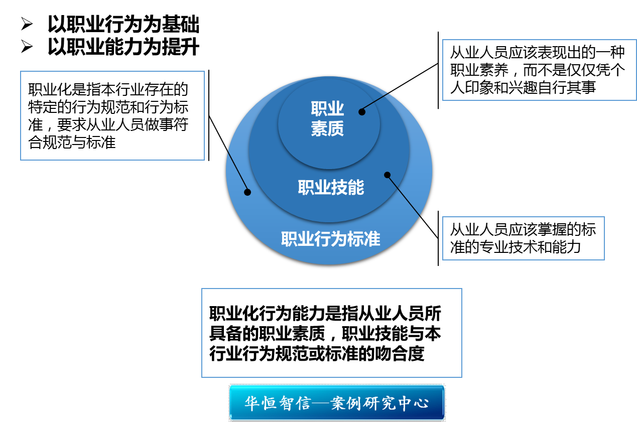 但是在现实生活中,很多企业并没有向易宝一样能够认识到职业化的重要性,或者认为职业化比较空泛,没有实际的作用,或者对职业化的理解不够深入,仅仅是停留在职业化着装,职业化工作方法。事实上,职业化对企业的发展和长期保持竞争力有重要的作用。华恒智信咨询专家对员工职业化管理有深入的研究,认为企业应该从以下三个角度理解职业化。