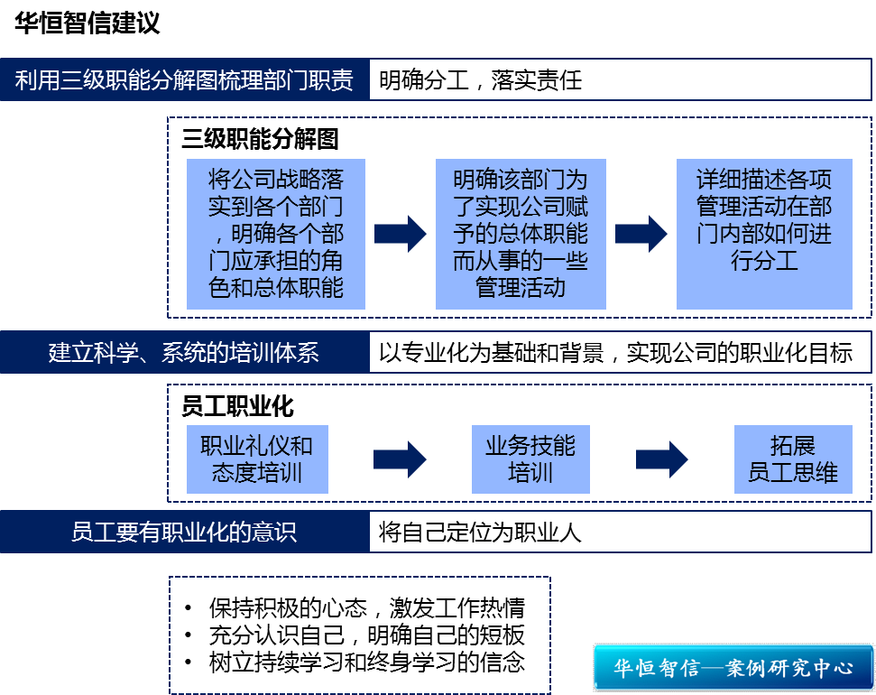 通用电气公司130年的发展中,一直坚持由职业经理人来管理企业,很好地践行了职业化管理的信仰。GE成功的职业化管理实践为其他企业树立榜样,也坚定了它们走职业化道路的信念。企业的职业化管理仅仅请来几位职业经理人就能够实现吗?答案是否。企业的职业化管理离不开每个员工的职业化发展。那么,如何打造职业化的员工呢?华恒智信一直致力于提升企业的职业化水平,针对这一问题,顾问专家提出几点建议: