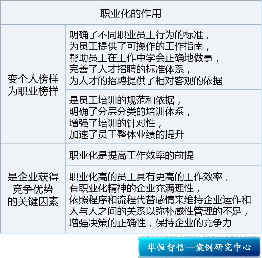 第一,职业化变个人榜样为职业榜样。职业化涉及员工管理的各个模块。首先,职业化明确了不同职业员工行为的标准,为员工提供了可操作的工作指南,帮助员工在工作中学会正确地做事,完善了人才招聘的标准体系,为人才的招聘提供了相对客观的依据。同时,他还是员工培训的规范和依据,明确了分层分类的培训体系,增强了培训的针对性,加速了员工整体业绩的提升。