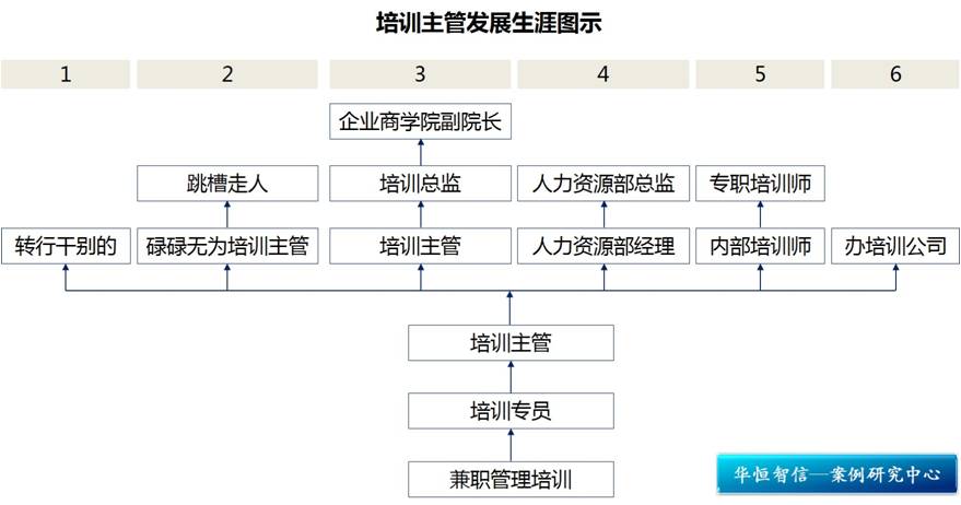 那么培训主管,离职或不离职的出路在哪里呢,先看下面培训主管的发展生涯图示(包含着诸多可能):