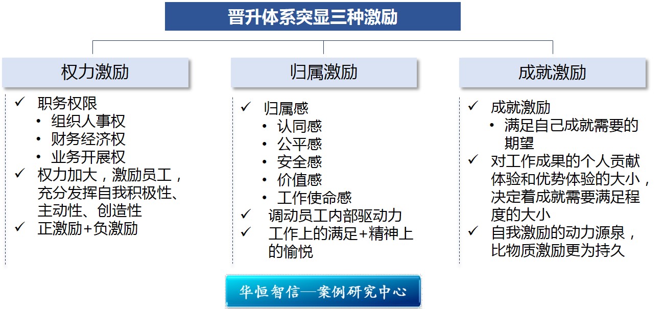 对于激励问题进行过深入研究的哈佛大学的戴维•麦克莱伦指出,人有三类具有激励作用的基本需要:权力的需要、归属的需要和成就的需要。满足不了个人的基本需要,就不会有激励作用!正是个人需求引发人们做事的动机,这种动机又会支配人的行动,最后这种行动得到很好的激励,从而满足了个人的需求。而这三种基本需要,员工职业晋升体系都可以满足。