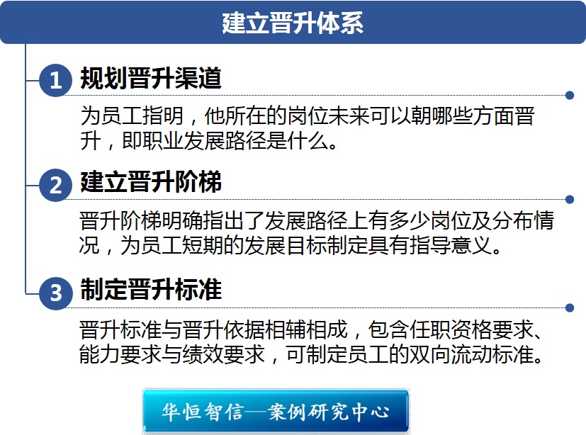 拿破仑说过,“不想当将军的士兵不是好士兵”,对于职场中人而言,晋升几乎是每个人的目标。晋升的激励作用是不容忽视的,晋升是对员工工作能力的肯定和进一步期望,对员工能起到褒奖和鼓励的双重作用,就心理需求而言,职位的晋升比薪酬更易让员工感到满足。同样,对企业而言,完善的晋升体系不仅能改善员工士气和绩效,还能激发人才的献身精神,增强员工的归属感,同时给其他员工树立目标,激发企业活力。建立完善的晋升体系对企业对员工是双赢的,那么,建立晋升体系需要注意一些什么问题呢?华恒智信分析员认为主要有以下几个方面: