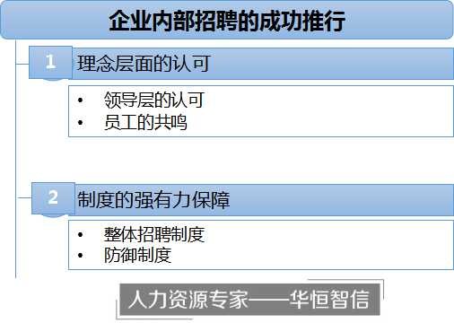 内部招聘的魅力已吸引了一部分企业,它们也都开始了自己的探索之路。那如何让内部招聘在企业中更好地发挥作用呢?华恒智信认为,任何一项政策的成功推行都离不开两条路线的相辅相成:理念层面的认可和制度层面的强有力保障。