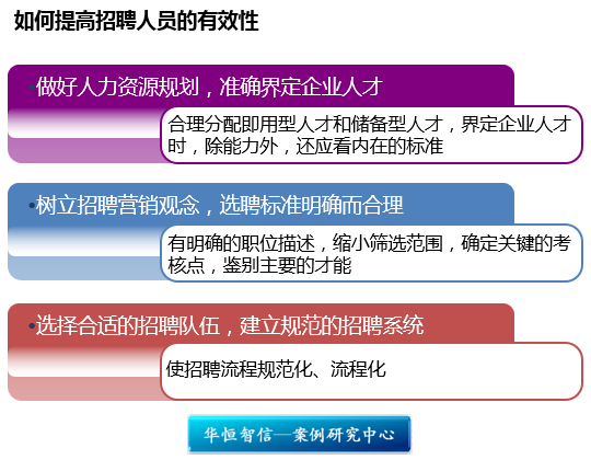 招聘是人力资源管理的第一步,招聘效果的好坏和招聘工作的效率直接影响到企业其他部门各项工作的顺利开展,直接影响到企业发展战略能否顺利实现。华恒智信建议,人力资源部应通过以下三方面提高招聘人员的有效性:
