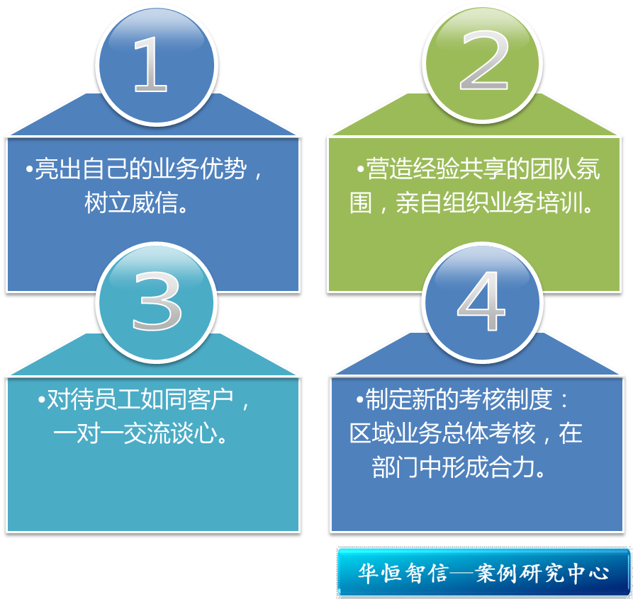 区域业务总体考核,在部门中形成合力以前部门的考核方式是按每个人做出的业绩来计算,但A君认为只有改革才能加强人与人之间的合作,才能形成合力。于是他将业务部门划分成华东区、华北区、华南区等大块,又将几个工作人员分到一组,考核业绩时以区域考核。