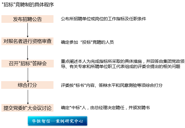 中层经营管理者"招标"竞聘制。许继从1985年就在企业内部打破原来的干部、工人身份和部门界限,对所有中层经营管理者岗位实行公开"招标"、公平竞争、择优聘用。"招标"竞聘制的具体程序为:一是发布招聘公告,公布所招聘单位或岗位的工作指标及任职条件,符合条件的员工自愿报名"投标"。工作指标包括该单位的销售收入、利润、新产品开发、产品产量、安全生产、资产保值增值、产品合格率、用工、分配等15个方面的内容。参加竞聘的基本条件是接受并完成所公布的指标。二是对报名者进行资格审查,确定参加“投标"竞聘的人员。三是召开"招标"答辩会,由竞聘者宣读标书,重点阐述本人为完成指标所采取的具体措施,并回答由集团党政领导、有关专家和所聘单位职工代表组成的评委会提出的相关问题。四是评委按"标书"内容、答辩水平和民意测验等项综合打分,选出"候选中标人";每位竞聘者的最高综合得分为275分,其中标书100分、答辩100分、民意测验50分、主管副总经理加分10分、总经理加分15分。五是提交党委扩大会议讨论,确定"中标"人,由总经理决定聘任,并颁发聘书。进入90年代以来,许继根据实际情况对经营管理者招标竞聘制不断加以完善,先后制订了《许继中层领导管理条例》和《许继中层领导招标竞聘办法》,在招标条件、评委组成、打分比例等方面进行了规范,使这项改革逐步制度化和程序化。比如在竞聘条件上,规定了政治素质、领导能力、学历、本企业工龄等通用条件,一些特殊岗位,如产品研究开发处室和重要管理部门的领导,则对知识水平和本专业工作年限作了更高的要求。