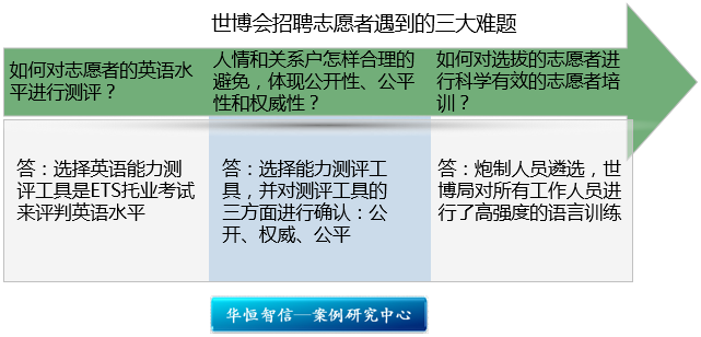 对于60万报名者竞争7.7万个志愿者岗位“僧多粥炒”的问题,设定一个测评和选拔的标准首先应该体现“公平性”,还要保证标准设定的权威性和客观性,世博会选择的英语能力测评工具是ETS托业考试,经过上海外国语学院高级翻译的专家的二次面试和一些国外研究机构的分析研究,证实该英语能力测试工具的科学合理性。企业在选择能力测评工具时,首先应该对测评工具的三方面进行确认——公开性,即工具设定标准、方法和手段的公开性;权威性,工具测评的结果是被社会所认可,乃至全球所认可的方法,即能令被测评者信服;公平性,即工具通过公平的手段选择出最适合的人选。