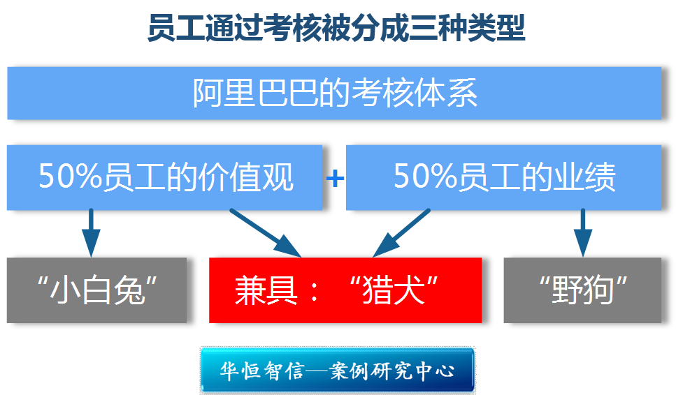 这家公司的考核体系是这样的:员工的价值观与业绩各占50%的权重。员工通过考核被分成三种:有业绩,但价值观不符合的,被称为“野狗”;事事老好人,但没有业绩的,被称为“小白兔”;有业绩,也有团队精神的,被称为“猎犬”。