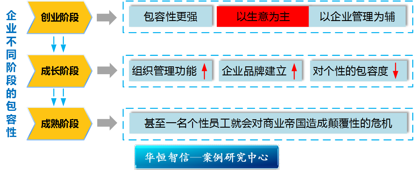企业的创业阶段、成长阶段、成熟阶段、突破阶段需要不同程度的包容,一般是创业阶段,包容性更强,这个阶段以生意为主,企业管理为辅;随着企业进入成长阶段,组织管理功能逐渐加强,企业的文化特征逐渐显现,企业的品牌逐步建立,对个性的包容度应逐渐降低;企业趋于成熟期,包容个性的程度应更低,因为组织规模越来越大,人员队伍众多,社会影响面更大,所以如果无原则包容或包容度把握不好,就会影响到企业形象,甚至一名个性员工就会对商业帝国造成颠覆性的危机。