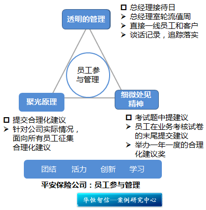 平安保险公司无论是实行“总经理接待日”制度、提出合理化建议政策还是在员工业绩考核的考试题中提建议方式,归根结底为,平安保险公司提倡“员工参与管理”的管理理念,通过员工参与管理的方式,不断集中发现企业存在问题,并集思广益的解决存在问题,并且使之不断督促平安员工成为“诚实、信任、进取、成就”的优秀员工,督促平安成为“团结、活力、创新、学习”的优秀组织。