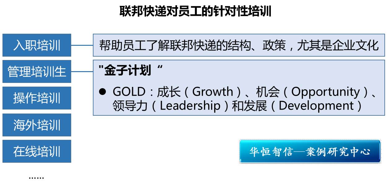 入职培训:帮助员工了解联邦快递的结构、政策,尤其是企业文化。进入公司之后每个人都要进行岗前培训,即使是递送员,至少也要有40个小时的上岗培训。我们还为所有与客户接触的员工提供为期6个礼拜的计划性的集中的新雇员技巧培训。