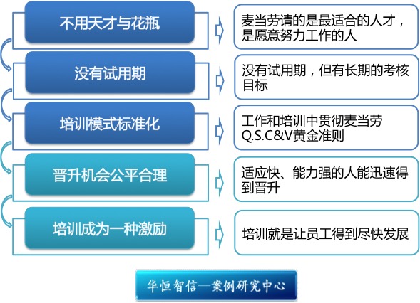 麦当劳的培训理念是:培训就是让员工得到尽快发展。麦当劳的管理人员都要从基层员工做起,升到餐厅经理这一层,就该知道怎样去培训自己的团队,从而对自己的团队不断进行打造。麦当劳公司的总经理每三个月就要给部门经理做一次绩效考核,考核之初,先给定工作目标,其中有两条必须写进目标中,那就是如何训练你的下属--什么课程在什么时候完成,并且明确告诉部门经理,一定要培训出能接替你的人,你才有机会升迁。如果事先未培养出自己的接班人,那么无论谁都不能提级晋升,这是麦当劳一项真正实用的原则。由于各个级别麦当劳的管理者,会在培训自己的继承人上花相当的智力和时间,麦当劳公司也因此成为一个发现和培养人才的大课堂,并使麦当劳在竞争中长盛不衰。