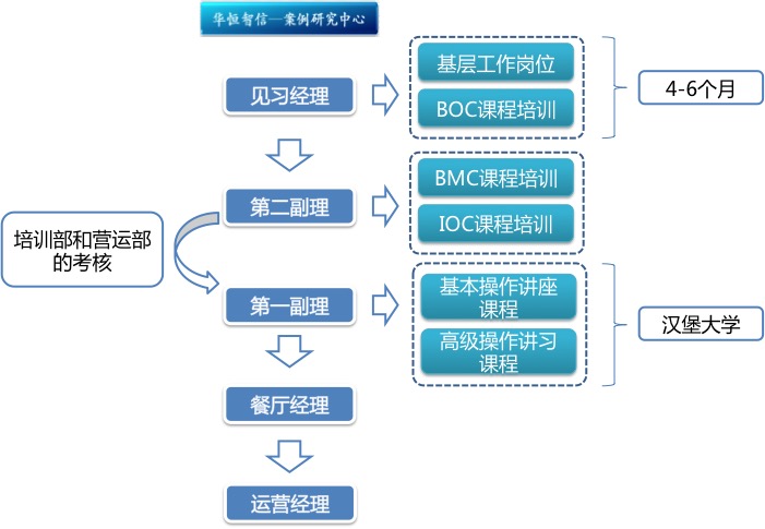 在麦当劳,晋升对每个人都是公平合理的,适应快、能力强的人能迅速掌握各个阶段的技术,从而更快地得到晋升。面试合格的人先要做4-6个月的见习经理,其间他们以普通员工的身份投入到餐厅的各个基层工作岗位,如炸薯条、做汉堡包等,并参加BOC课程(基本营运课程)培训,经过考核的见习经理可以升迁为第二副理,负责餐厅的日常营运。之后还将参加BMC(基本管理课程)和IOC(中间管理课程)培训,经过这些培训后已能独立承担餐厅的订货、接待、训练等部分管理工作。表现优异的第二副理在进行完IOC课程培训之后,将接受培训部和营运部的考核,考核通过后,将被升迁为第一副理,即餐厅经理的助手。以后他们的培训,全部由设在美国及海外的汉堡大学完成,汉堡大学都配备有先进的教学设备及资深的具有麦当劳管理知识的教授,并提供两种课程的培训,一种是基本操作讲座课程;另一种是高级操作讲习课程(AOC)。美国的芝加哥汉堡大学是对来自全世界的麦当劳餐厅经理和重要职员进行培训的中心,另外,麦当劳还在香港等地建立了多所汉堡大学,负责各地重要职员培训。一个有才华的年轻人升至餐厅经理后,麦当劳公司依然为其提供广阔的发展空间。经过下一阶段的培训,他们将成为总公司派驻其下属企业的代表,成为“麦当劳公司的外交官”。其主要职责是往返于麦当劳公司与各下属餐厅,沟通传递信息。同时,营运经理还肩负着诸如组织培训、提供建议之类的重要使命,成为总公司在这一地区的全权代表。