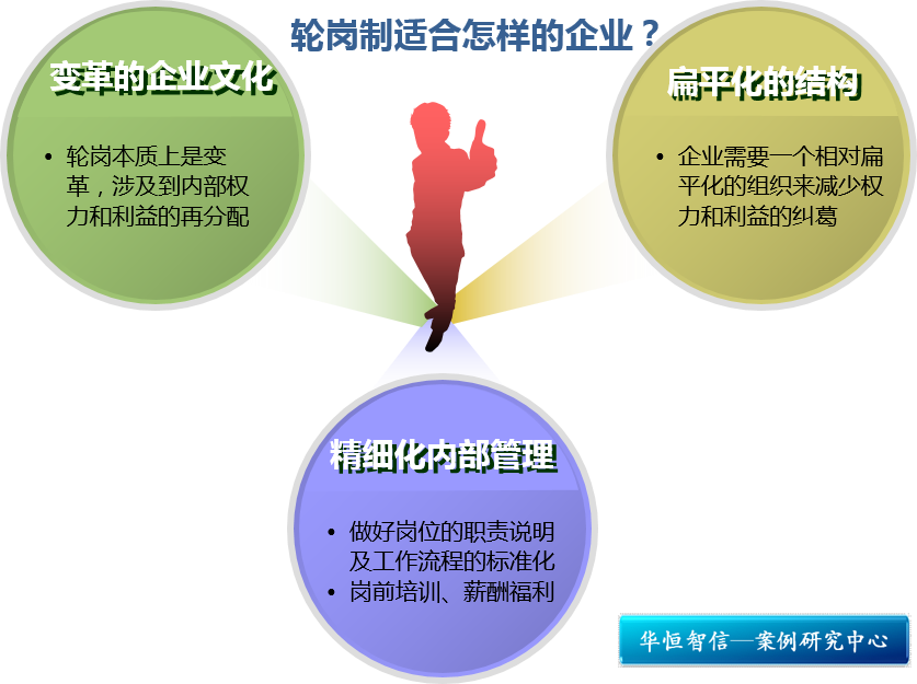 第一,变革的企业文化。轮岗本质上也是变革,也涉及到内部权力和利益的再分配,一个缺少变革文化的企业在推进轮岗制度的时候将会面临大量保守者的阻挠。