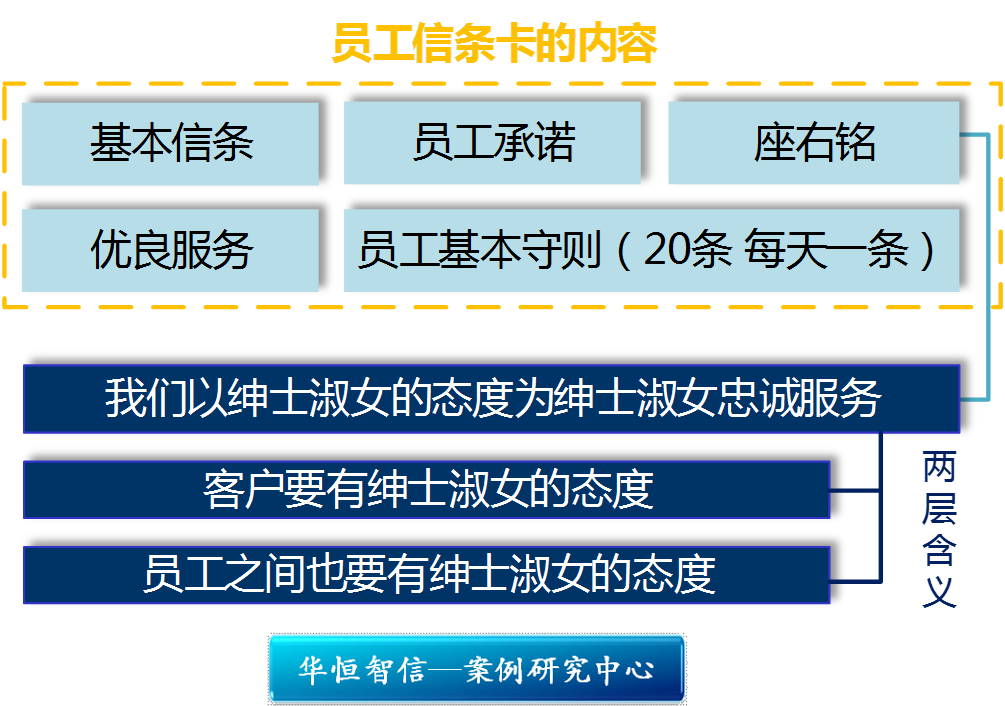 在这个员工信条卡里,包括公司的基本信条、员工承诺、座右铭、优良服务的三个步骤、员工基本守则五个部分,其中员工的基本守则是20条。狄高志介绍,学习基本守则中的一条是所有的丽嘉员工的每日功课。当20条学完了之后,再从头学起,周而复始,从不中断,目的是让公司的每一位员工,都将公司的理念深深地印在心中。