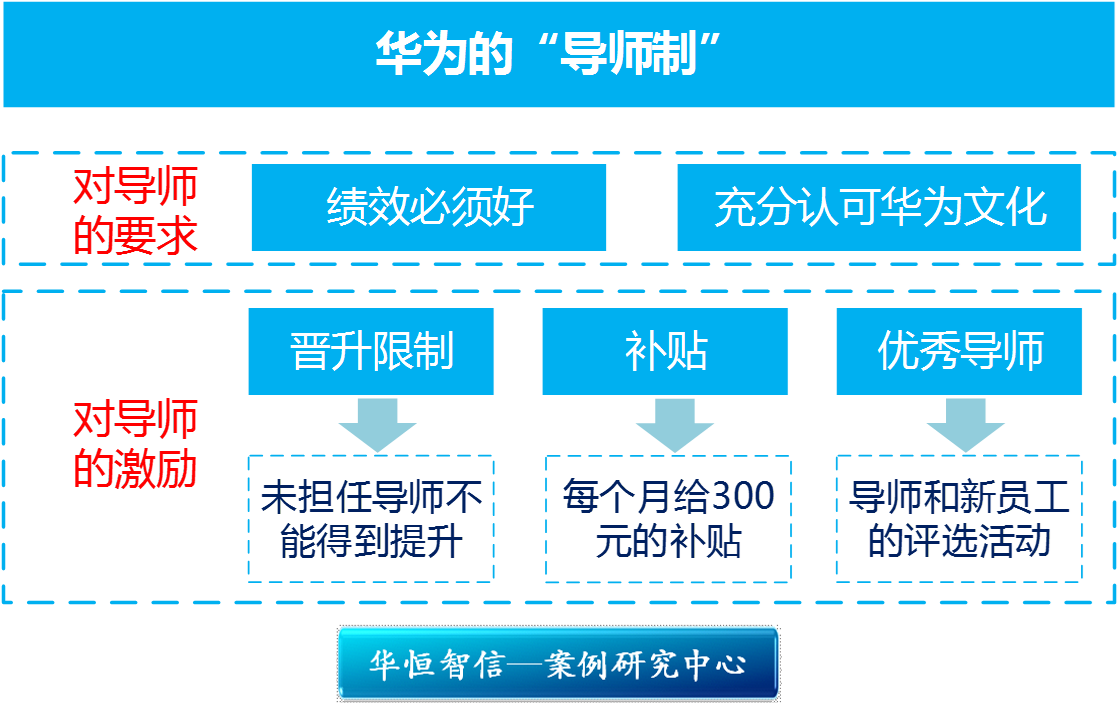 华为对导师有相应的激励政策:一是晋升限制,规定凡是没有担任过导师的人,不能得到提拔;二是给予导师补贴;三是开展年度“优秀导师”评选活动,以及导师和新员工的“一对红”评选活动,在公司年会上进行隆重表彰。这些措施,激发了老员工踊跃担任导师的积极性,和带好新员工的责任感。