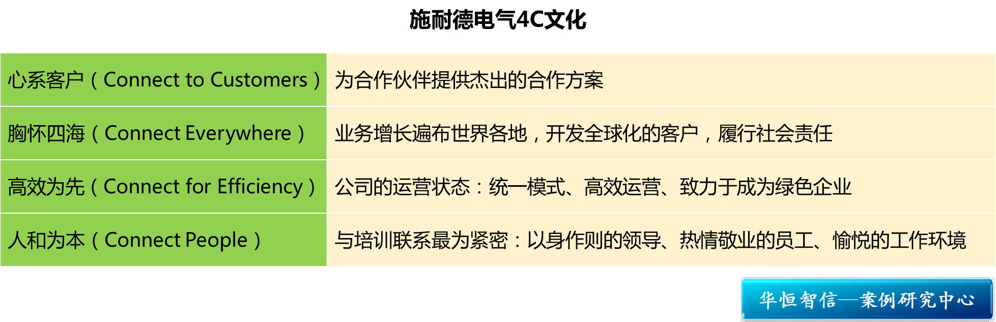 每隔三年,施耐德电气整个集团会推出一套“三年战略”,自2013年起集团开始推行CONNECT的三年发展战略,这一全球理念不仅涵盖了学习与发展方面,更要贯彻到每一个施耐德电气员工的所有行为当中。公司所有业务目标围绕着4C文化展开,它体现了百年名企的深厚底蕴,也是施耐德电气人才发展的根本源头。