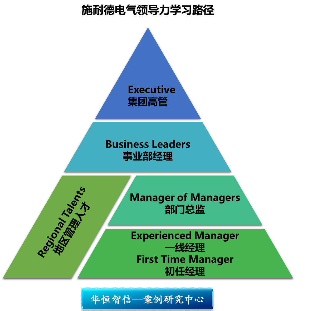 施耐德电气的领导力学习路径(见下图)以CEO为标准N,N-1为区域领导,这二者都属于集团高管;N-2为事业部领导(副总裁、总监以上级别);N-3、N-4则代表部门总监和初级经理。施耐德电气会根据每年核心岗位的预测要求,将每一层级的组织发展需求定制化,变成学习项目。其中,领导力圆桌论坛(Leadership Roundtable)作为针对公司所有管理者进行宣传、推动新的战略、传递管理理念的项目是亮点之一。每月,3—4名高管层级的领导者会受邀担当讲师,进行精心策划和准备,就某一个话题讨论发散,开放给所有经理人听课,持续2至3个小时。这些措施都体现了施耐德电气对领导梯队培养的重视程度。