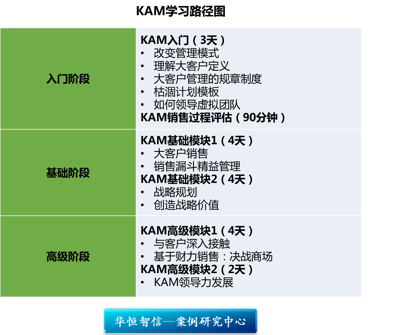由于是自主开发KAM项目,整个团队为施耐德电气节约了超过260万元的费用。KAM的培训方式包括课堂讲授、阅读、案例分享、角色扮演、沙盘演练、实际操作等,需要经过三个阶段——KAM Orientation(入门阶段)、KAM Essential(基础阶段)、KAM Advanced(高级阶段)(见下图)。