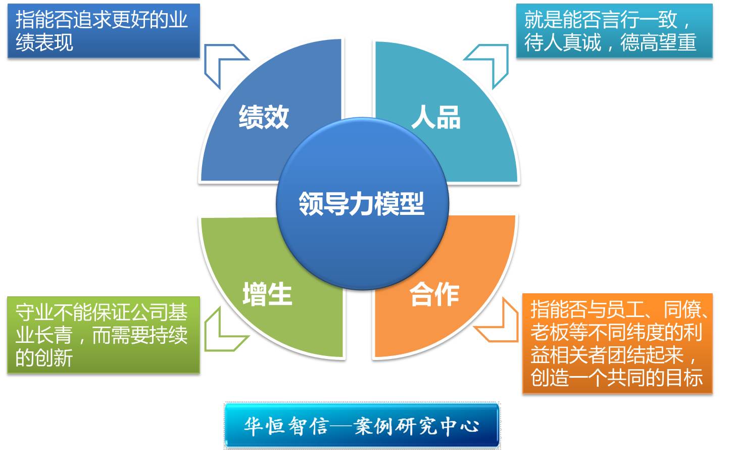 据王晶介绍,这个升级版的领导力模型主要包括四个象限内容。第一象限核心是人品(Authenticity),就是能否言行一致,待人真诚,德高望重;第二象限核心内容是绩效(Performance),指能否追求更好的业绩表现;第三象限是增生(Growth),守业不能保证公司基业长青,而需要持续的创新;第四象限是合作(Collaboration),指能否与员工、同僚、老板等不同纬度的利益相关者团结起来,创造一个共同的目标。