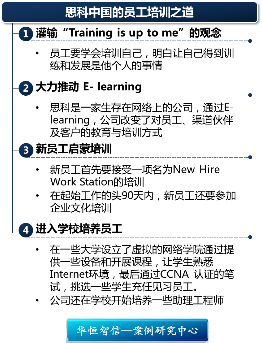思科中国有限公司重视人才的培训工作,通过设立E-learning学习体系和虚拟网络学院的建设,为员工提供了一个比较完备的培训体系,并使得“Training is up to me”这一信念深入人心,使得员工能够自发地提升自我,从而促进了企业的发展。