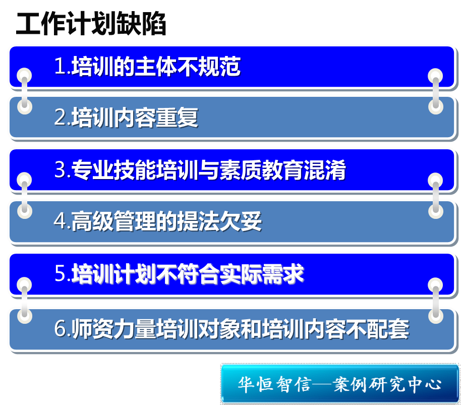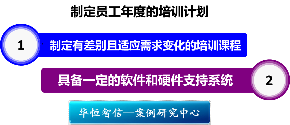 2、员工的培训体系应该具备一定的软件和硬件支持系统。例如培训体系需要具备的硬件支持包括——培训的系列课程及课件,培训的师资队伍等,软件的系统则包括——培训责任系统和培训制度系统。