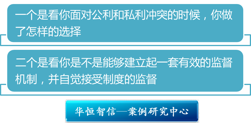 一个是看你面对公利和私利冲突的时候,你做了怎样的选择;一个是看你是不是能够建立起一套有效的监督机制,并自觉接受制度的监督。企业的管理,涉及到的最关键的三个权力:人权、财权、事权(含信息权或知情权)。
